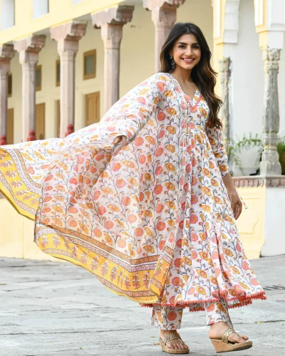 ফ্লোরাল প্রিন্টেড আনারকলি টিসি-কটন-কুর্তা উইথ ট্রাউজার্স স্বর্ণলতা