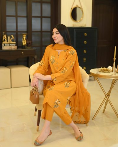 ফ্লরাল কাবলি কাটিং ড্রেস থ্রী-পিস সেলাই করা সেট কালো এবং হলুদ