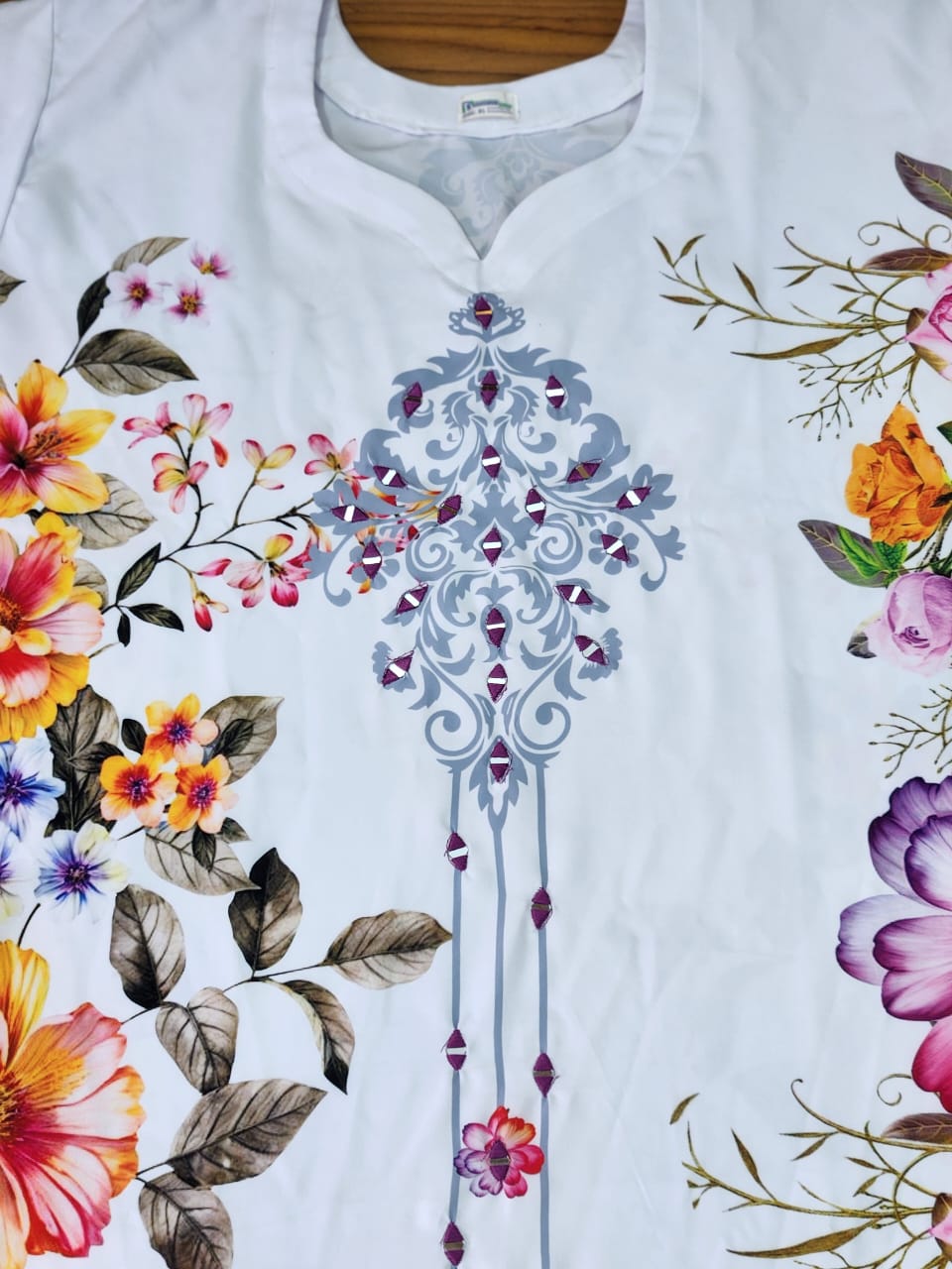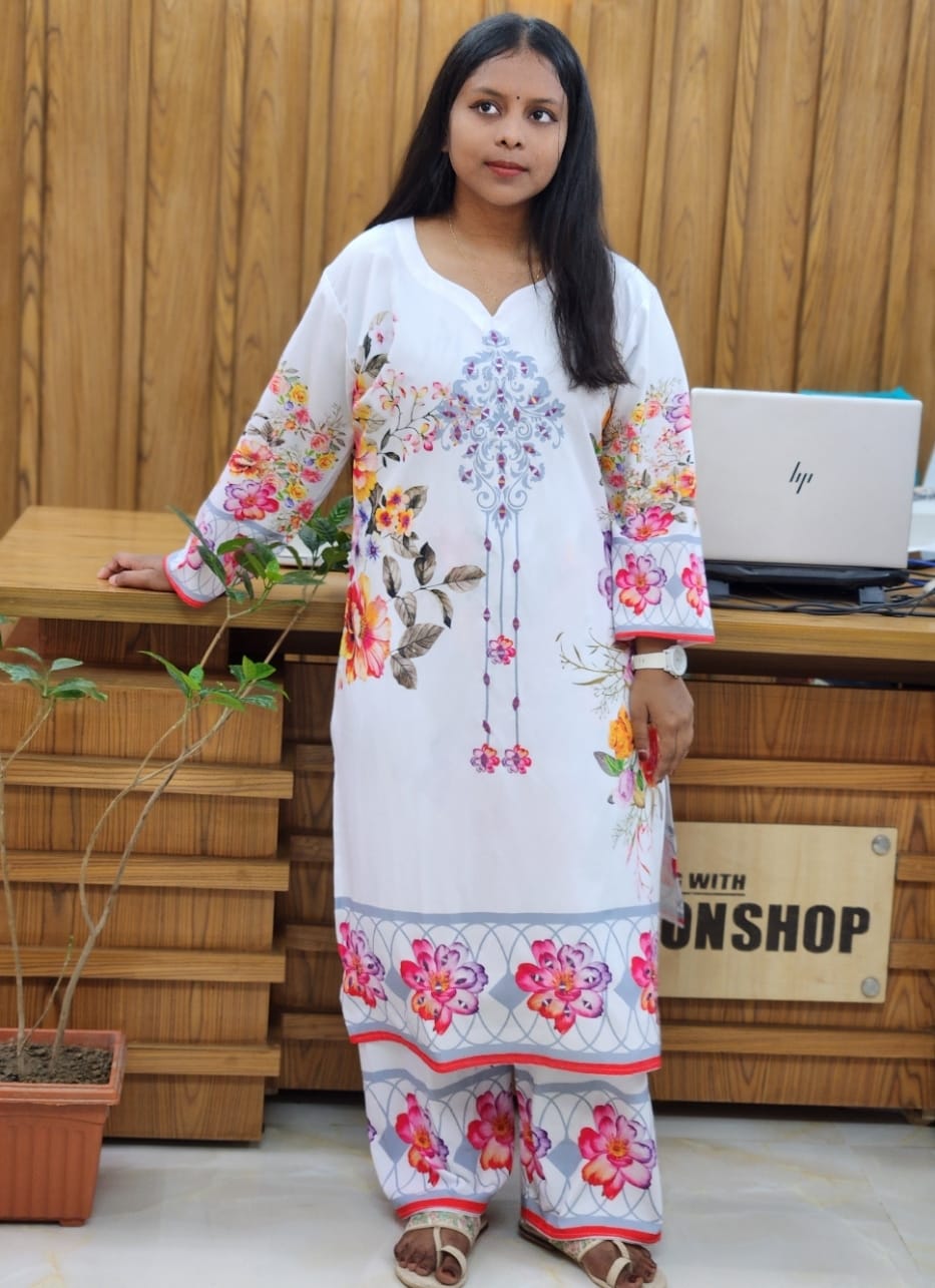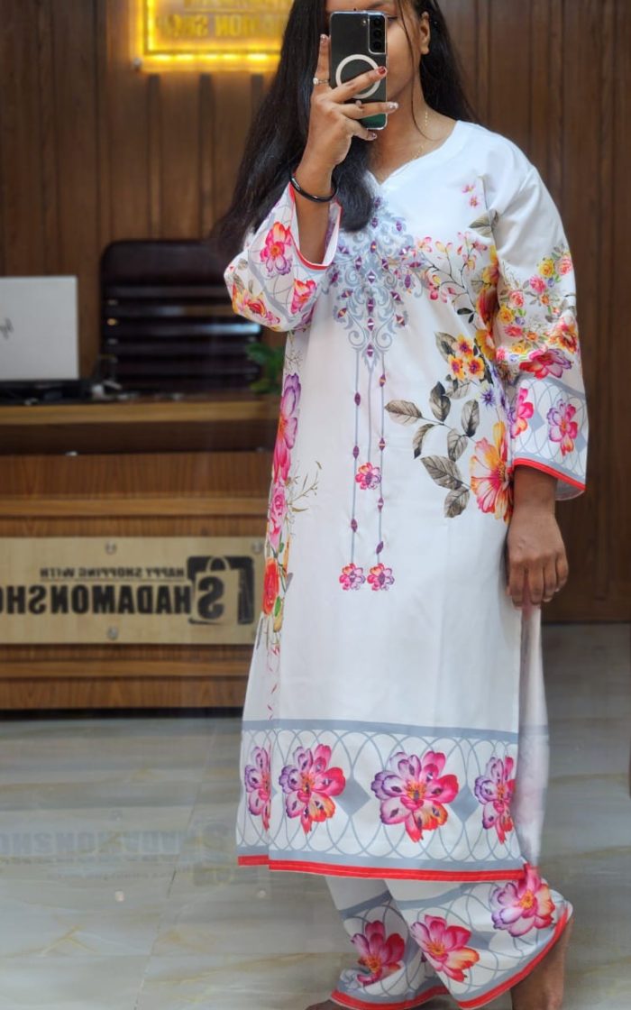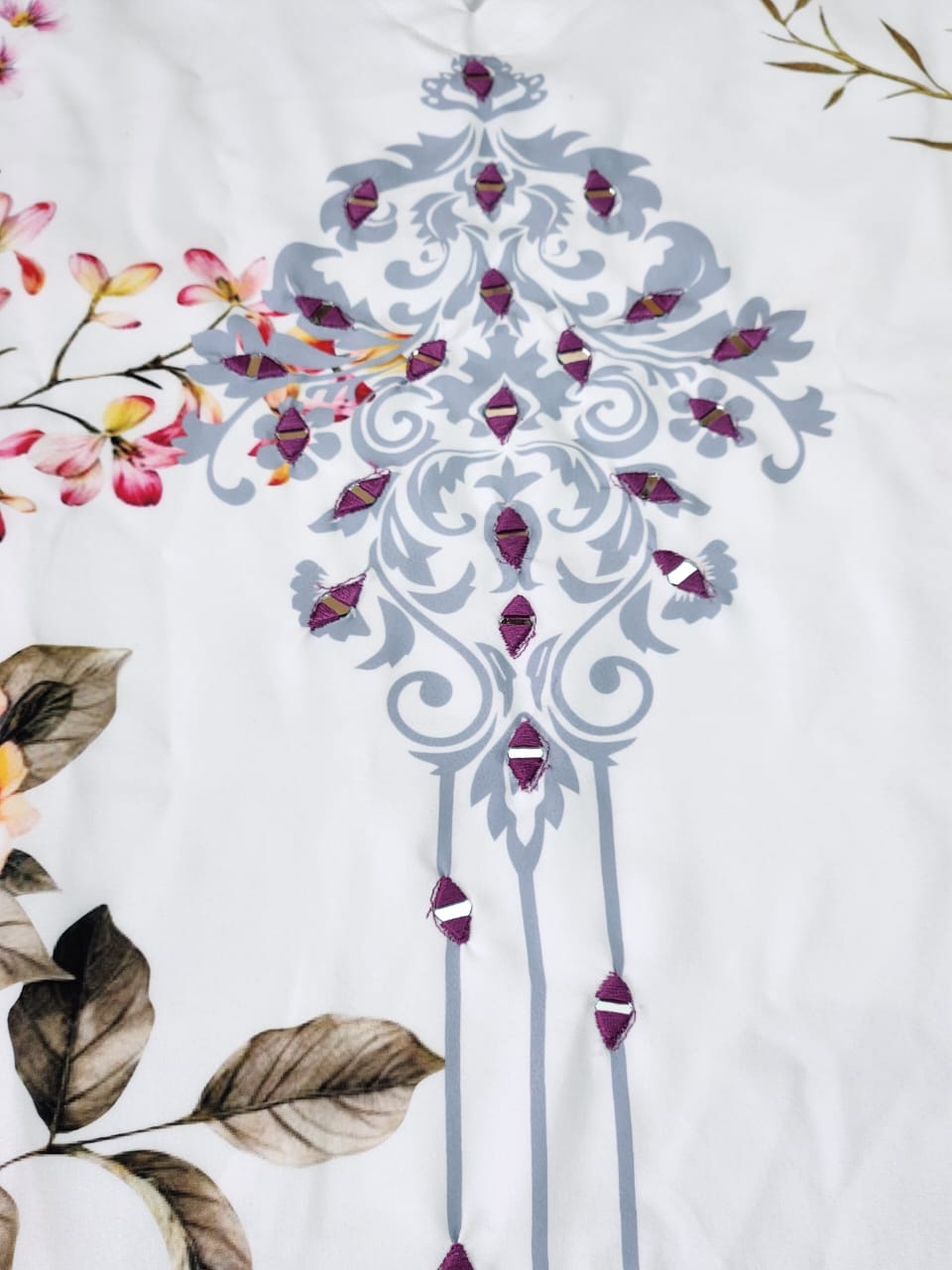 đˇ Ivory base with hanging floral motif, stitched co-ords in premium china micro fabric