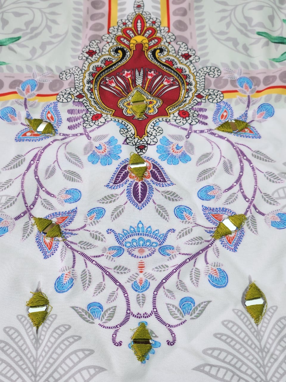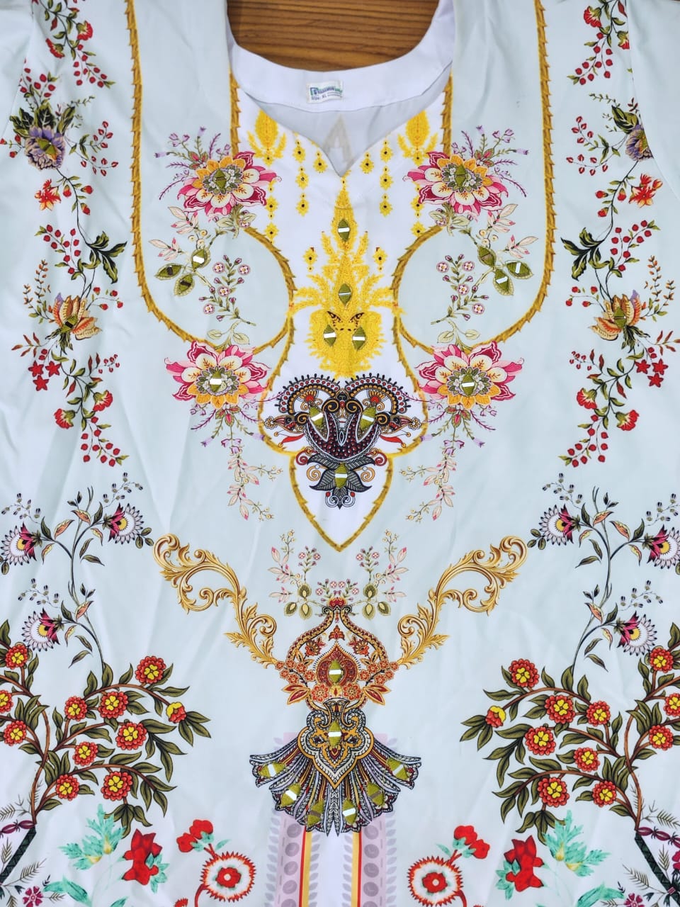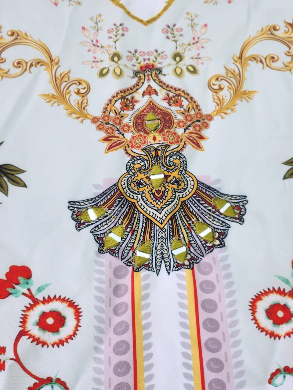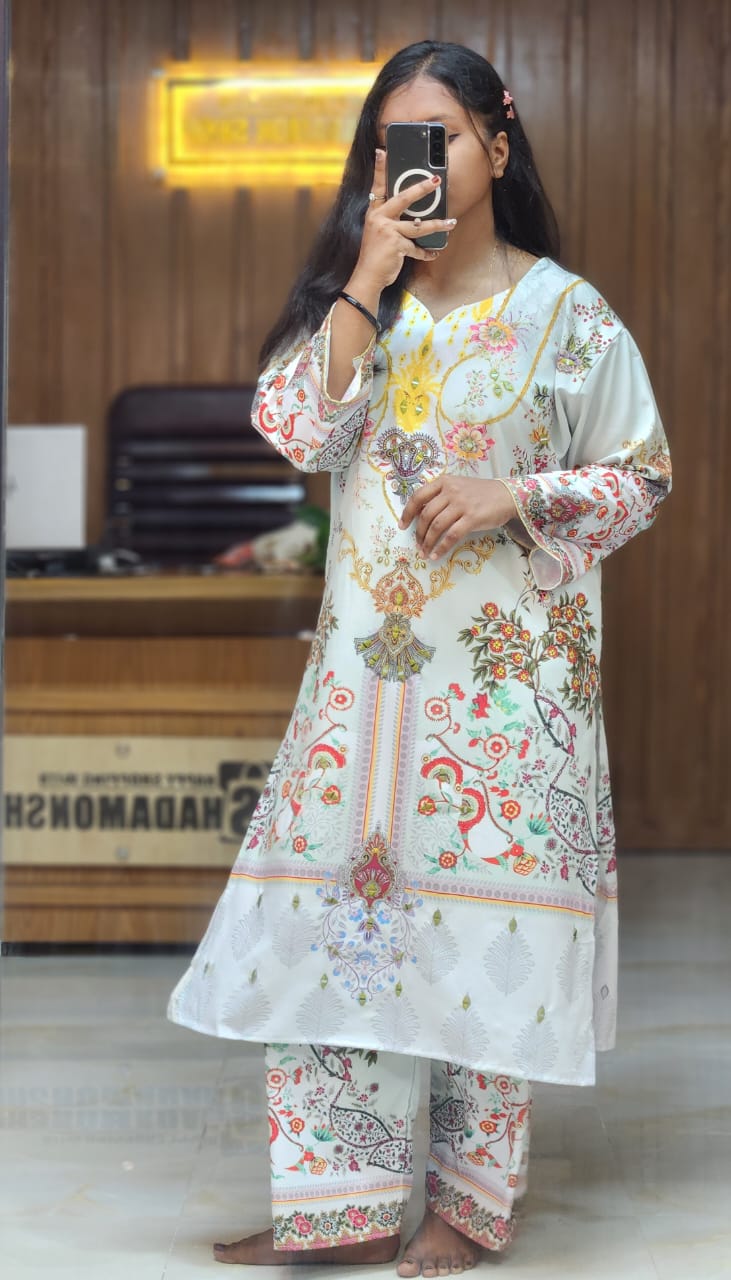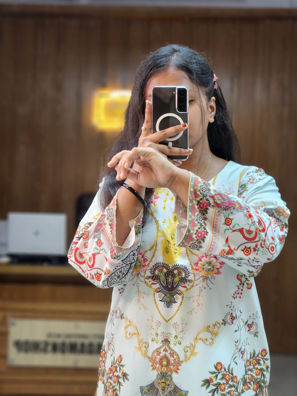🌟 White base with golden motifs & colorful florals, premium co-ords stitched with mirror work