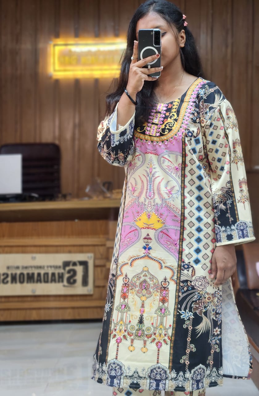 কলকা সুতি টু-পিস সেট স্ক্রিন প্রিন্টেড গাউন এবং পায়জামা